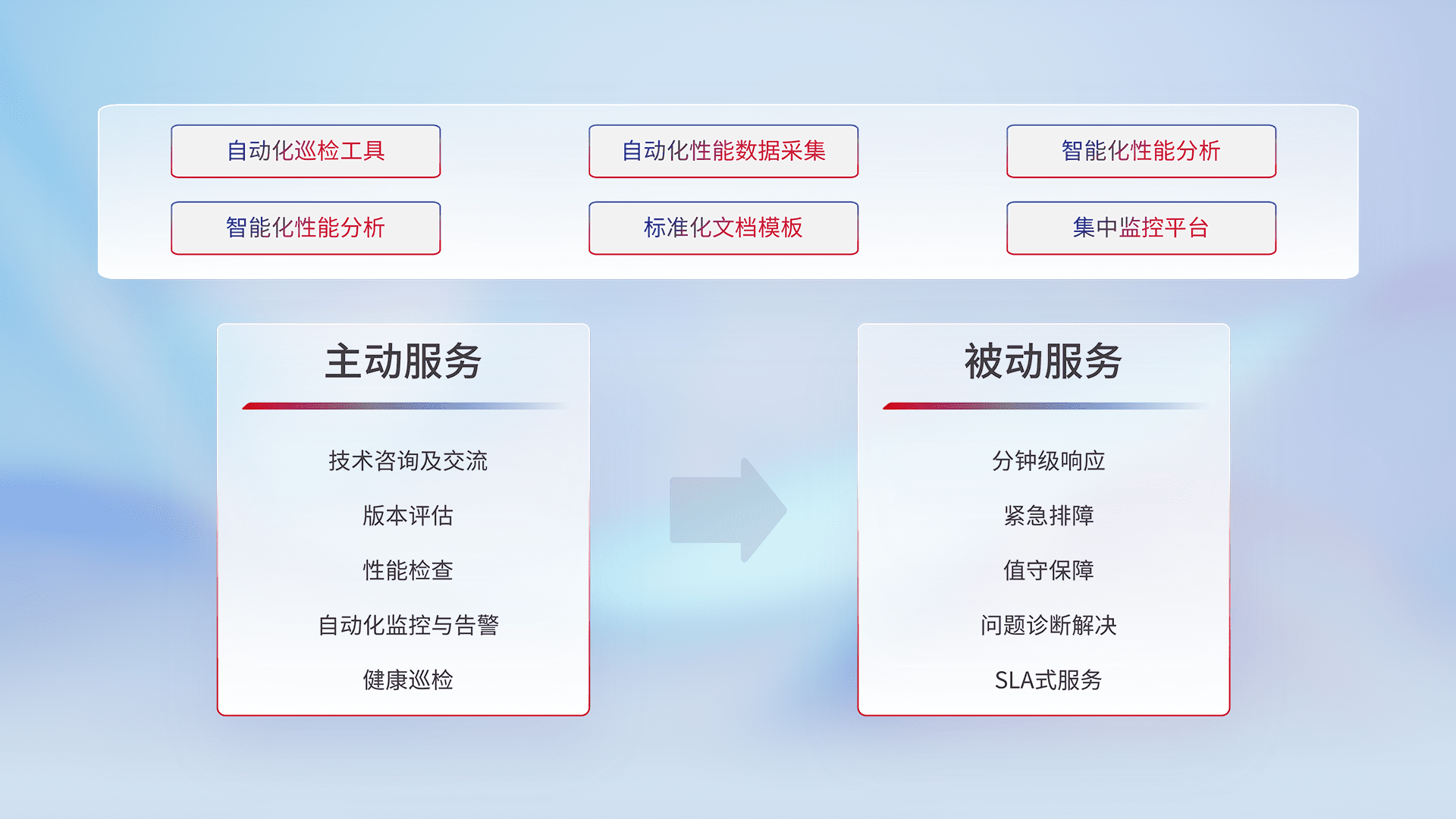 智能化工具和标准化文档,,保障服务质量,,提供主动服务(包含技术咨询、、版本评估、、、性能检查、、自动化监控与告警、、、健康巡检)和被动服务包含(分钟级响应、、、、紧急排障、、值守保障、、、、问题诊断解决、、、SLA服务)。。。。