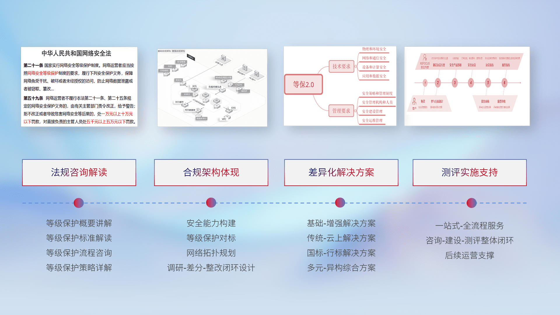 通过专业的法律咨询解读、、合规架构体现、、差异化解决方案、、、、测试实施支持等服务,,,,为客户量身打造等保合规体系。。。